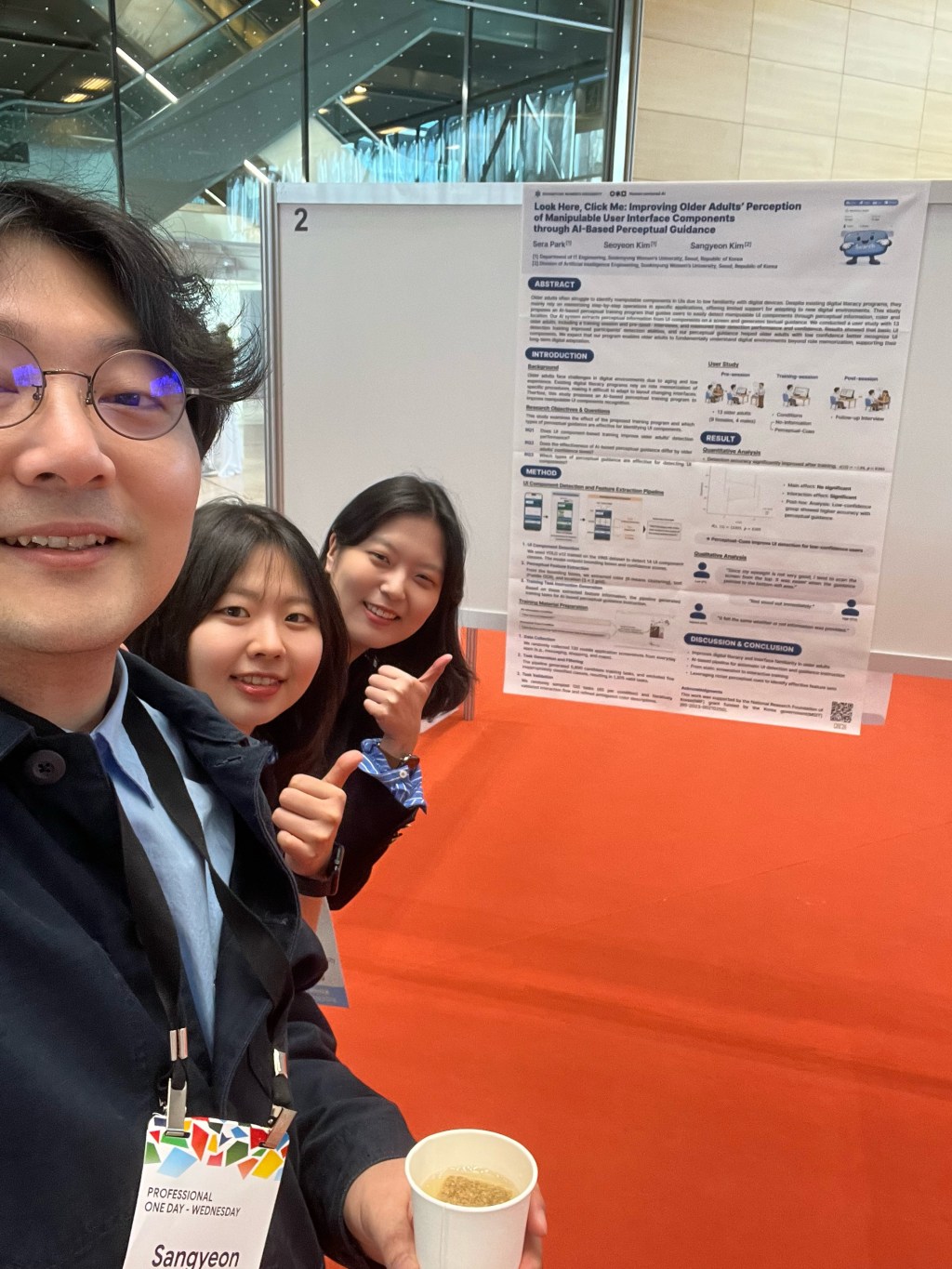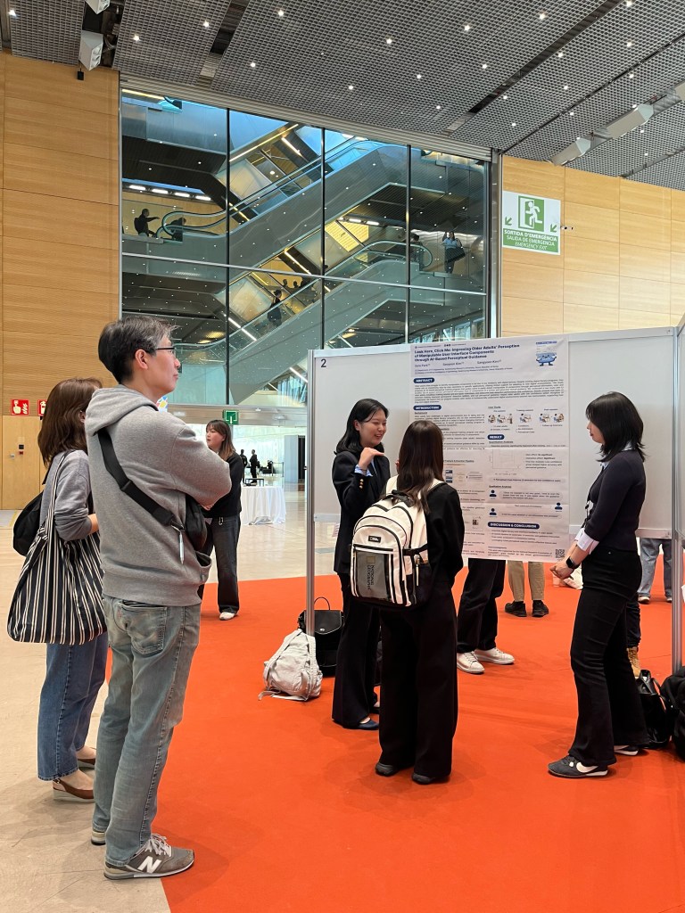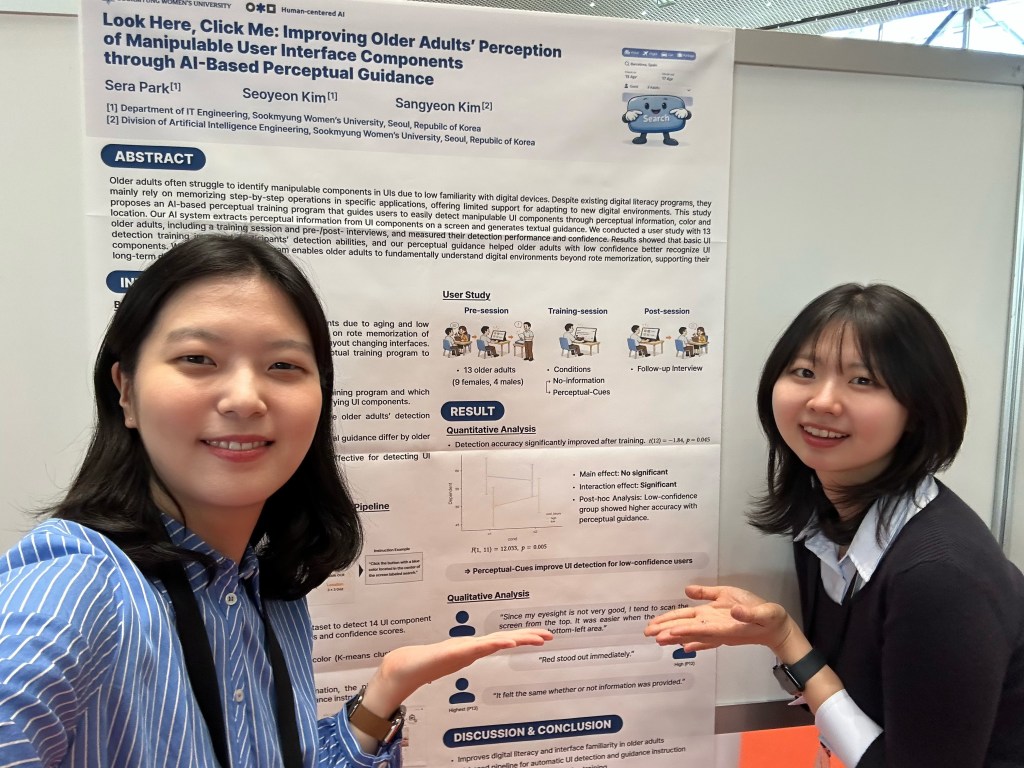 이번 학회에서는 석사과정 박세라, 김서연 학생의 논문이 게재 승인되어 포스터 발표를 진행했습니다. 해당 논문 “Look Here, Click Me: Improving Older Adults’ Perception of Manipulable User Interface Components through AI-Based Perceptual Guidance”는 Extended Abstracts of the 2026 CHI Conference on Human Factors in Computing Systems에 게재되었습니다.